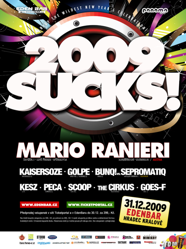 Jediný opravdu exkluzivní silvestrovský mejdan v Hradci Králové 2009 SUCKS! začne s úderem sedmé hodiny večerní tech-houseovým setem hradeckého matadora DJe Goes-F. Po něm Vás rozparádí svými propracovanými technosety DJs Peca a Scoop. Rok 2009 definitivně uzavře speciální vystoupení nejlepšího českého techno DJe Kaisersoze, který si pro Vás připravil speciální půlnoční překvapení. Silvestrovská euforie ale neskončí pouze ohňostrojem a přípitky šumivým vínem. Do Nového roku 2010 Vás totiž přivítá hlavní hvězda večera – rakouský DJ a producent numero uno – Mario Ranieri! Kdo z Vás zažil jeho loňské vystoupení v EdenBaru, jistě ostatním potvrdí, že jeho vystoupení si zkrátka nelze nechat ujít! Po druhé hodině ranní vystřídá Maria nejlepší český hard-techno DJ Golpe, následovaný společným vystoupením světoznámého slovenského DJe a producenta Sepromatiqa s první dámou českého hard-techna DJane B.UNQ! Opravdu ostrou tečkou za tímto našlapaným mejdanem budou vystoupení DJs The Cirkuse a Kesze.