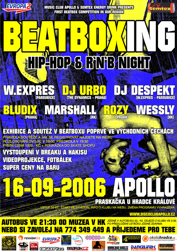V sobotu 16. září 2006 se koná ojedinělá akce ve východních Čechách. V Music Clubu Apollo v Praskačce se koná hip hopová akce Beatboxing spojená s Hip Hop & R`n`B Night. Čeká vás exhibice a jediná soutěž v beatboxu v našem regionu. Utkají se zde přihlášení i nepřihlášení beatboxeři z celé České republiky a předvedou návštěvníkům to nejlepší z jejich beatboxu.