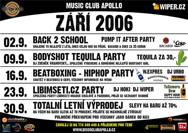 Music Club Apollo v Praskačce u Hradce Králové pro Vás má další vychytané akce na měsíc Září. Sledujte program a hlavně oficiální web www.discoclubapollo.cz pro kompletní informace. Nezapomeňte, že do klubu se dostanete nejen po vlastní ose, ale také díky naší drožce na telefonu 774 349 449.