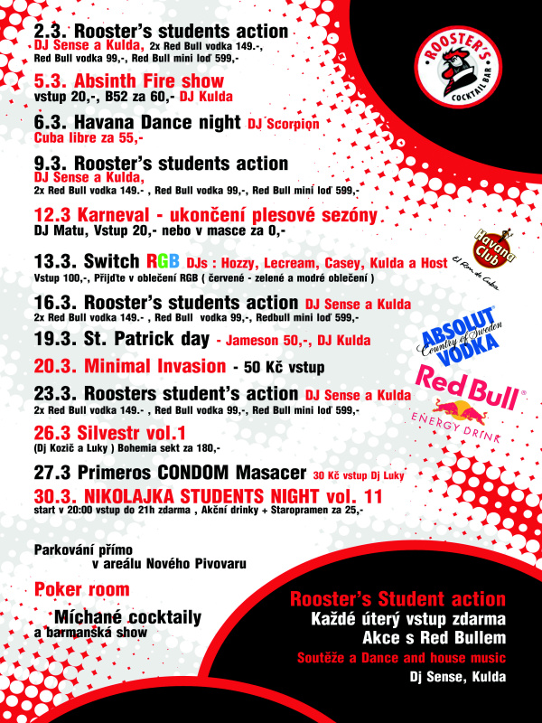 A máme tady program Rooster's Coktail Baru , který se nachází v bývalém pivovaru v Hradci Králové, na měsíc Březen. Čekají Vás vychytané akce jako např. Rooster's Students Action, Primeros Condom Masacer, Nikolajka Students Night a další