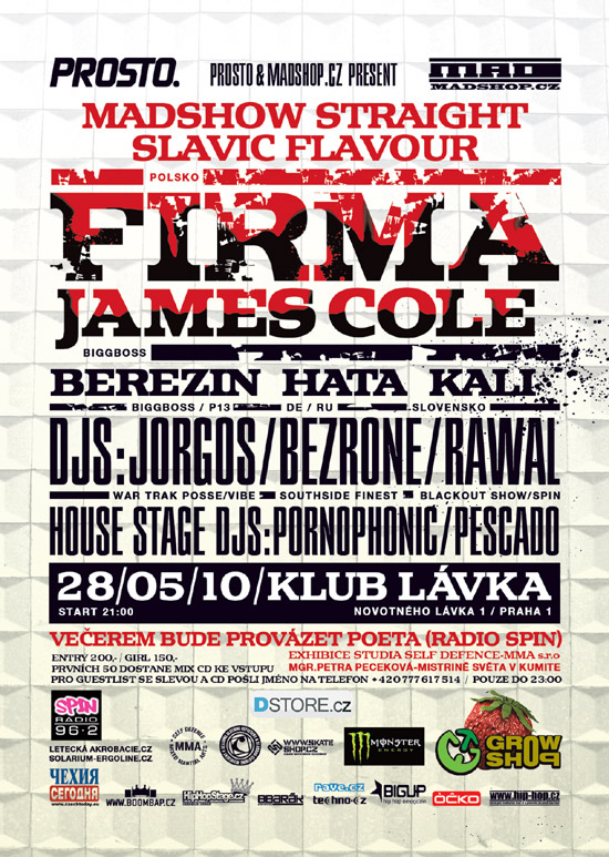 Party Mad Show STRAIGHT SLAVIC FLAVOR se odehraje už 28. května v klubu Lávka a dorazí polské hvězdy Firma, svojí crazy halucinační sólo show rozbalí James Cole, ze Slovenska přijede představit své debutové album newcommer Kali a ruský rap zastoupí u nás dobře známý Berezin. Ten o sobě naposledy dal vědět mixtapem, který si můžeš volně stáhnout tady. http://www.rap.ru/_Uploaded/File/multimedia/Berezin_Dj_Andrew_WiLD-IN_MIX_WE_TRUST.zip