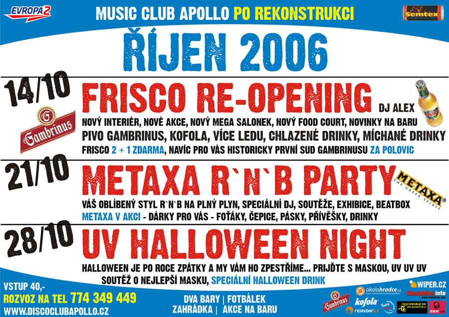 Music club Apollo prošel rekonstrukcí a 14. října otevírá své brány v novém prostředí, novými akcemi, novinkami na baru, a novým food barem. Vychytejte si své akce do konce měsíce, máte se opravdu na co těšit. Již 14. října uvidíte důvod, proč bylo jeden týden zavřeno :-) NOVÝ INTERIÉR, NOVÉ AKCE, NOVÝ MEGA SALONEK, NOVÝ FOOD COURT, NOVINKY NA BARU – GAMBRINUS, KOFOLA, VÍCE LEDU, CHLAZENÉ DRINKY, MÍCHANÉ DRINKY.