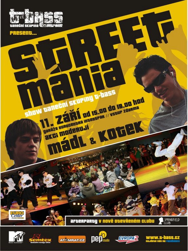 Taneční skupina T-BASS vás zve na velkolepou show s názvem Streetmania 2010. Uvidíte spoustu tance v podání všech složek taneční skupiny T-BASS od 2,5 letých dětí až po naše seniorské mistry ČR! Můžete se těšit na taneční show vytvořenou přímo pro tuto akci. Nebude samozřejmě chybět kvalitní ozvučení, světla, videoprojekce a bohatý doprovodný program. Celou show vás budou provázet bombarďáci VOJTA KOTEK a JIRKA MÁDL!