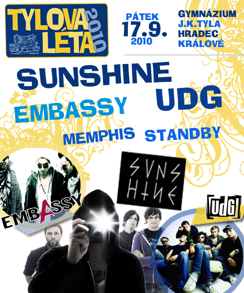 V pátek 17. zaří vypukne opět v areálu gymnázia J. K. Tyla v Hradci Králové festival Tylova Léta. Jako kapely zde vystoupí Embassy, Memhis, Standby, UDG a nakonec Sunshine.