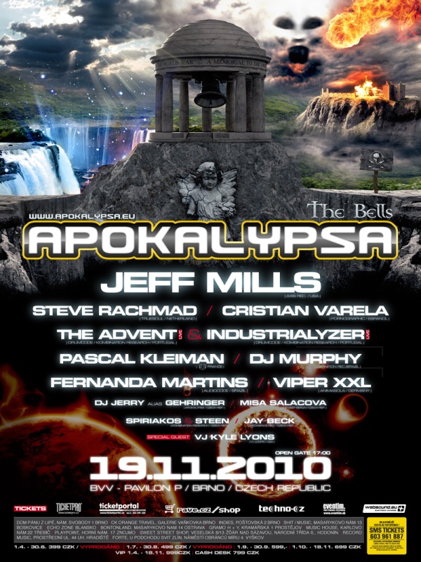 Do České republiky, z USA, na Apokalypsu The Bells, přijíždí osoba, kterou by měl každý fanoušek techna alespoň jednou v životě slyšet a vidět. Jen on vám svým charismatem a neskutečným technickým způsobem předvede, čemu sám 26 let věří a co neustále dál propracovává - dámy a pánové, je nám velkou ctí, že vám můžeme po 3 letech zvažování a usilování potvrdit pana Jeffa Millse na legendární Apokalypse, pojmenovanou dle jeho hymny The Bells -