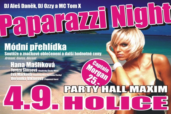 Paparazzi Party Tour Night! V rámci Tour po celé České republice, zavítá tento cirkus i k nám do Maximuse, jakožto jediného klubu u nás na Východě! Tato jedinečná Show v sobě ukrývá svůdnou módní přehlídku se známými tvářemi, jakýmiž jsou Hana Mašlíková, Tereza Šimsová (finalistka České Miss), Eva Marková (finalistka Miss Východní Čechy), Veronika Viktorová (Paparazzi Face). Dále na vás čekají soutěže o hodnotné ceny v podobě značkového oblečení od Armani, Guess a Akcent. K tomu vás našlápnutým večer provede DJ & MC Ozzy a residentní MC Tom X. Hudebně vás bude krmit váš residentní DJ Aleš Daněk a hrdly prolévati budeme tolik oblíbeného Captaina Morgana za 25,- vočí (“,). Tak „vo co go“? První „zářiovka“ je zde! To je na Maximiř v září miř (“,)
