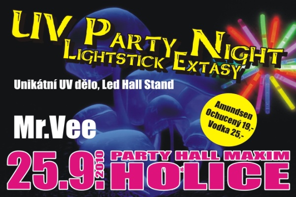 .no ovšem? Mr Vee je zde, a opětovně přiváží vymazleninu vymazlenin! Neskutečná nálož, kterou dokáže pouze a jen Mr Vee! Mistr převleků, rychlého mixu a ďábelského tempa z kotle pekelného! Mr Vee tentokráte krom Flam projektorů a dalších atrakcí ze svého Cirku s sebou přiváží jedinečný unikát mezi unikáty a to UV DĚLO, které posadí na pozadí i ostřílené z ostřílených. Kromě UV děla si pohrajeme i s Lightsticky, kterých vám rozdáme opravdu mnoho mnoho mnoho, a vytvoříme tak jedinečný barevně světelný efekt. Ohnivá Show podtržená UV DĚLEM, Lightsticky a bílou dekorací v Maxu uzavírá první školní měsíc, měsíc září. K tomu již klasický Cenový Masakr na Barech doplněný lahodně ochuceným Amundsenem za 19 vočí či křišťálově čistým destilátem od strýčka Amundsena za 25 vočí. No a s poctivým lábáním odkazu starého Amundsena obdržíte výměnou mraky dárečků a to opravdu lákavých (“,) Takže podtrženo sečteno! UV Party Night Lightstick Extasy & Mr Vee, Amundsen & White Decoration Party Night!