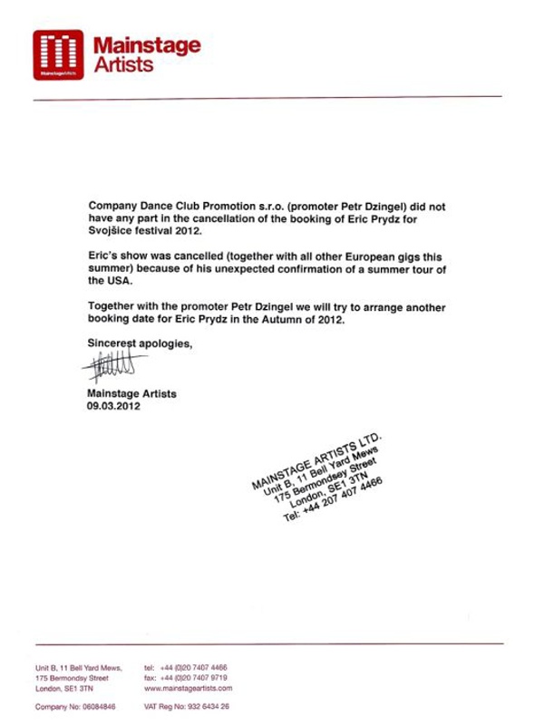 Management Erica Prydze zrušil již oficiálně potvrzené vystoupení na festivalu Svojšice 2012. Důvodem této náhlé změny je Ericovo tour po USA. Svojšice tak bohužel patří mezi dalších 20 evropských akcí a festivalů, které jeho management takto přesunul či zrušil. Promotér festivalu s managementem Erica Prydze momentálně pracuje na náhradním termínu jeho vystoupení v ČR, které by se mělo uskutečnit na podzim 2012, jak je uvedeno v prohlášení managementu níže.