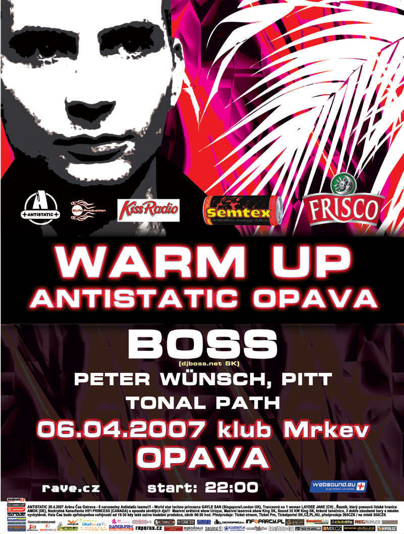V pátek 6.4.2007 se bude konat v Opavském klubu Mrkev warm up na velkou severomoravskou událost akci ANTISTATIC. Zahrát přijede slovenská ikona taneční scény DJ a producent BOSS, který bude hrát v tomto klubu poprvé!!