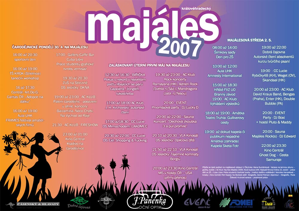 2. května Vás čeká beseda s pardubickou jednotkou AMNESTY INTERNATIONAL konaná v Aule UHK, kde se budete moci dozvědět něco o její činnosti a současném stavu lidských práv ve světě. Ve spolupráci s občanským sdružením Poco a Poco Animato Vám přinášíme představení „Guliverovy cesty“ (vhodné pro všechny věkové skupiny) v podání divadla Teatro Truhla, po němž bude následovat koncert kapely Sketa Fotr, který potrvá, slovy kapelníka, tak dlouho „dokud nepadnou muzikanti či posluchači“. Hudební nadšenci mohou navštívit koncerty v AC Klubu (David Kraus a kapela a další) nebo si vychutnat „předmajálesový nářez“ v CC Lucie, kde se představí kapely Rybičky48, Weget a Ska’N’daal. Nebude chybět ani party v klubu EVENT nebo noční promítání filmu „Ghost Dog – Cesta Samuraje“ v kině Centrál.