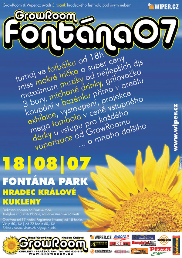 V sobotu 18. srpna 2007 se opět po roce otevřou již třetím rokem brány hradeckého open-air festivalu ve Fontáně v Kuklenách, tentokrát pod názvem GROWROOM FONTÁNA 07. Čeká Vás opět maximální zábava okořeněná několika novinkama, jako například turnajem ve fotbálku, soutěží Miss Mokré Tričko a díky hlavnímu partnerovi Grow Room spousta překvapení a dárků pro všechny.