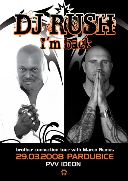 Akce má podtitul “Brother Connection” a je součástí východoevropského turné DJe Rushe a DJe Marca Remuse, který se v ČR představí poprvé. A máte se na co těšit, Marco si velikostí postavy i show za gramofony nezadá s Rushem a je to skutečně impozantní figura. Hraje přesně tak jako vypadá, tedy hodně tvrdě a nekompromisně. Vstupenky za vánoční cenu 299,-Kč jsou již v předprodeji v sítí Ticketportal. Cena ja platná do 24.12.2007.