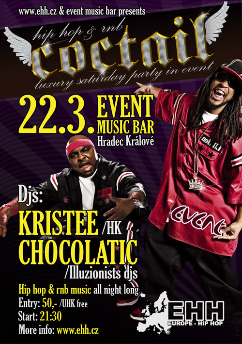 Chyběla ti v Hradci Králové pořádně vyvoněná párty? Nudí tě amatérští DJové a ulepený klub? Přichází nový seriál večerů v nejluxusnějším klubu ve městě - v Event music baru. Hip hopový koktejl se v hradeckém klubu Event rozjede už za necelých 14 dní, tedy 22.3.2008!