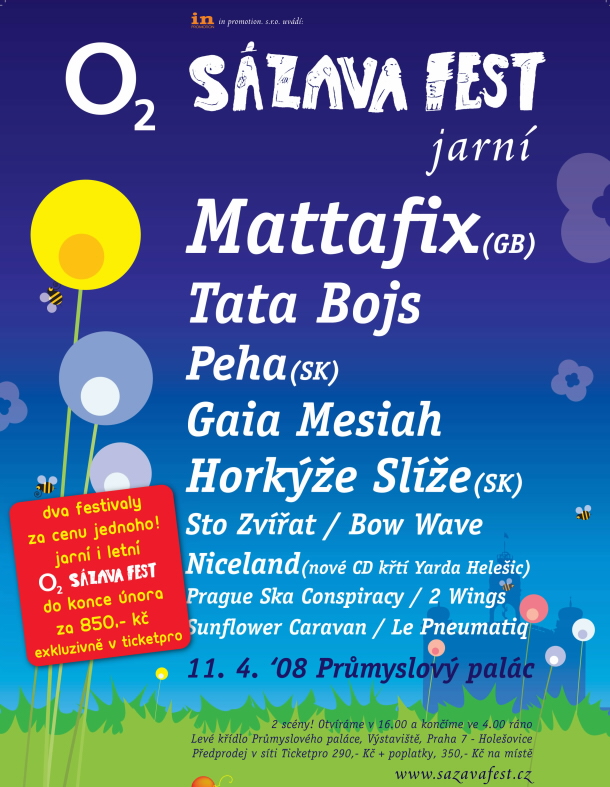 Nejen příroda se pomalu začíná chystat na svůj každoročně jedinečný okamžik jarního znovuzrození, ale také O2 Sázavafest se zlehka probouzí do dalšího ročníku. Po dostatečném zimním spánku se festivaloví fanoušci mohou opět těšit na Jarní O2 Sázavafest, který se letos uskuteční v pátek 11. 4. 2008.