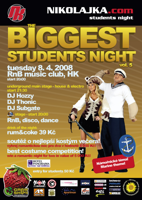 A teď pozor, jak už těm vnímavějším z kontextu vyplynulo, bude se tato party odehrávat v námořnickém duchu. Proto jsou vítány veškeré převleky alá námořník, mariňák, pirát, přístavní děva, plavčík, papoušek atd. A jsou nejen vítány ale dokonce i odměňovány. Nejlepší kostým vyhrává romantický pobyt pro dva v hodnotě 5000,- v nádherném hotelu. Druhé a třetí místo poukazy v hodnotě 3000,- resp. 2000,- a to už stojí za to, zapátrat v dědečkově pozůstalosti z Titanicu. Takže šťastnou plavbu a naviděnou v přístavu R'n'B klubu.