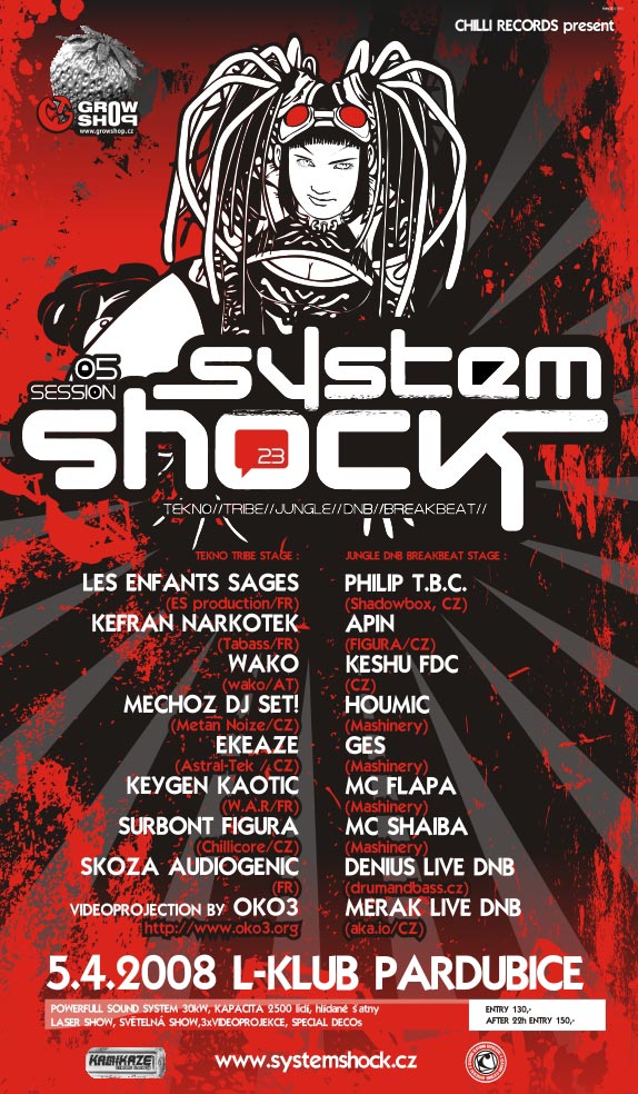 Další díl hard tekno a jungle party je opět zde. Nyní to bude její páte pokračování. Znovu to bude ryze česko - francouzský večírek, ale čeká na Vás i jeden rakouský DJ. Vše vypukne 5.4.2008 v pardubickém L-Klubu. Minulá System Shock byla hodně vydařená. Party bude mít opět dvě taneční pódia.
