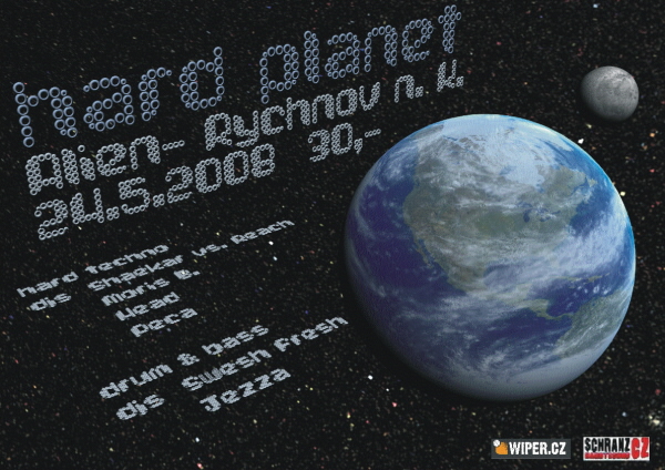 Klub Alien má za sebou řadu úspěšných párty jako hip hop, techno, hard techno, ale i zde proběhlo spousta plesů různých oldies párty, v tomto klubíku se můžete těšit také na míchané alko i nealko nápoje dva fotbálky hlavně na perfektní atmosféru párty. Začínat by měl hard techno DJ Moris B, který akcičku rozjede svižným tempem. Jeho sety jsou dost rychlé plné nečekaných tracků. Vystřídá ho DJ Swesh Fresh, který předvede d'n'b set. Jinak se věnuje hlavně tech housu. Jako dalšího DJe jsme pozvali Pecu, podle mého názoru to je zkušený schranzový DJ, proto si taky zaslouží hlavní hrací čas, jeho sety jsou velmi tvrdé a nekompromisní. DJ Jezza jako další je velice uznávaný DJ v oblasti d'n'b, má mnohaleté zkušenosti i z oblasti techna a zaslouží si druhý hlavní hrací čas a myslím si, že celou akci oživí a dá ji úplně jiný ráz. Jako předposlední DJ se představí Head, který patří do pardubického DJ Studia a už dlouhou dobu se věnuje technu a hard technu. A nakonec se nechte překvapit co předvede DJ Reach a Shaekar jen napovím, že se bude jednat o nekompromisní schranz. Line up a aktuální informace naleznete na