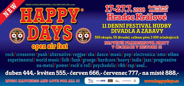 Na festivalu Happy Days Fest vystoupí stovky hudebních skupin, českých i zahraničních, známých hvězd i nových, kvalitních kapel, desítky divadelních souborů z oblasti pohybového a alternativního divadla, multimediální umělci a další. Součástí festivalu bude taneční stan, sportovní aréna, workshopy a umělecké dílny, módní přehlídky a prezentace. Vše vypukne ve Festival Parku v Hradci Králové ve dnech 17. - 27.7.2008.
