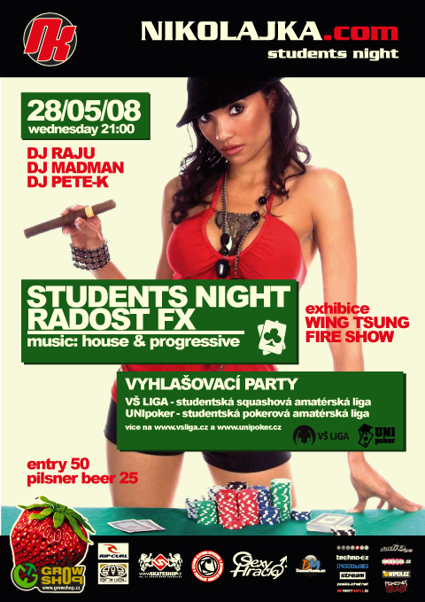 Poslední Nikolajka tohoto semestru se odehraje ve středu 28.5.opět v klubu Radost FX. Takže pokud už máte všechny zápočty a zkoušky za sebou nebo si od nich potřebujete na chvilku odpočinout, nemáte lepší možnost než zavítat do Radosti na Niko. Toto vydání bude ozvláštněno tím, že v jeho úvodu proběhne vyhlášení výsledků jarní sezony amatérské studentské squashové ligy ( www.vsliga.cz ) a studentské pokerové ligy ( www.unipoker.cz ).
