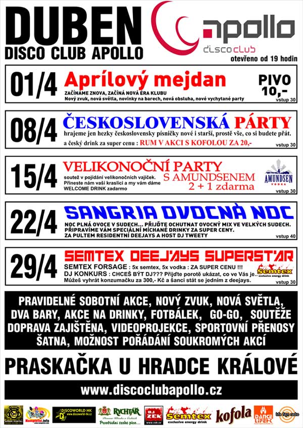 Přinášíme Vám program na duben v Disco clubu Apollo v Praskačce. Čekají na Vás opravdu vychytaný párty, v dubnu proběhne rekonstrukce klubu, čeká na vás nový fotbálek, nový sortiment nápojů a hlavně super akce se skvělou muzikou.