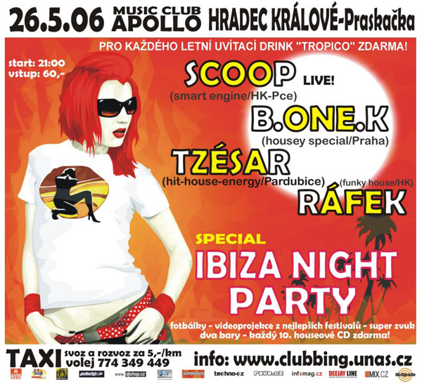 Máte rádi léto? Nemůžete se ho už dočkat? Chcete znát v předstihu nejnovější klubové pecky a hity, které budou hrát djs celé léto 2006? Jedna z nejoblíbenějších hot & sexy klubových nocí, která se stala symbolem léta a nespoutané zábavy zavítá v pátek 26.5.2006 exklusivně do music klubu APOLLO Praskačka u Hradce Králové. Přinášíme informace o originální IBIZA NIGHT PARTY Special!