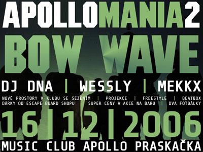 V sobotu 16. prosince 2006 se koná v Music Clubu Apollo v Praskačce poslední letošní hiphopová akce APOLLOMANIA2. Tentokrát se můžete těšit na karlovarskou formaci Bow Wave, kterou fanoušci znají díky megahitům Pašerácká a Město v mlze. Čeká Vás megakoncert na velkém pódiu se všemi jejich hity. Celou noc Vám bude hrát hradecký DJ DNA, o soutež v beatbox se postarají Wessly a Mekkx.